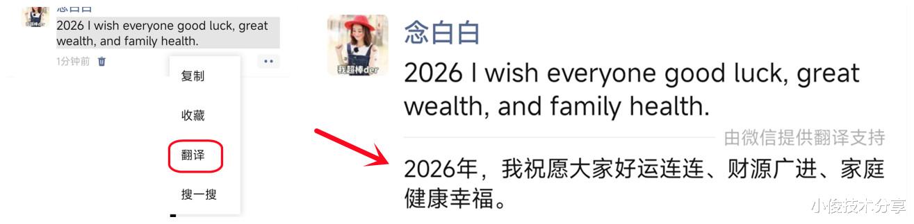 外国友人,在朋友圈发了一段新春祝福,作为九年义务教育的你,可能或多或少会有些看不懂,此时长按这段祝福,选择翻译,看到没,马上帮你整得明明白白,哪怕6年义务教育的你也看得明明白白!