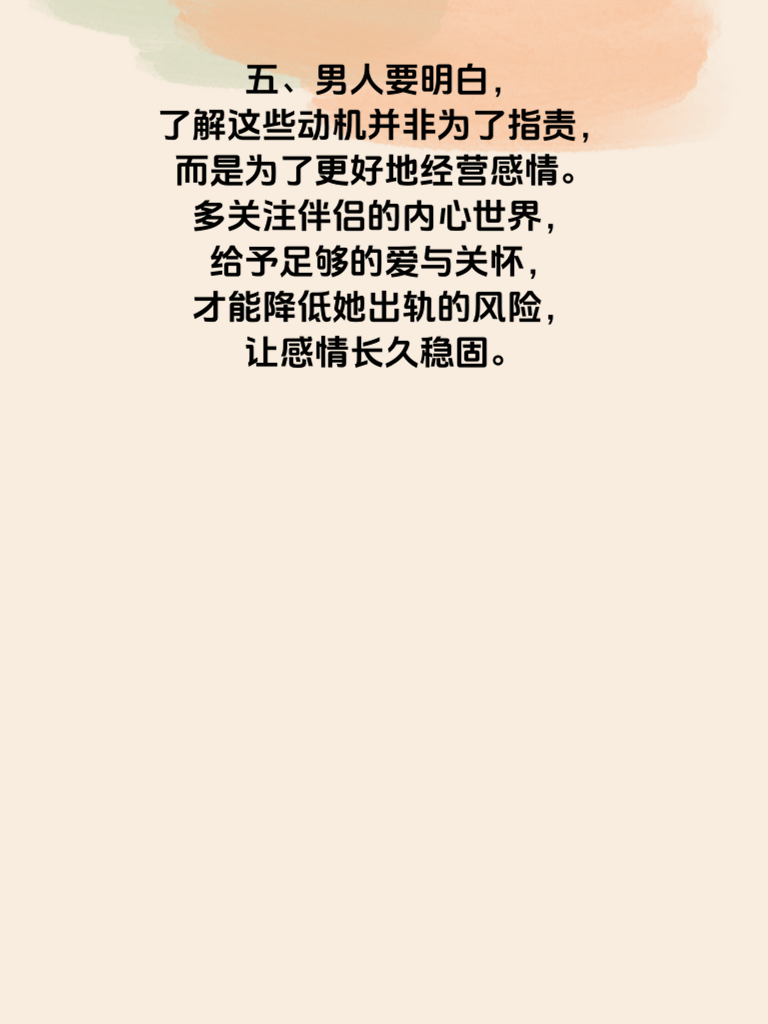一、女人出轨,并非偶然,背后往往藏着复杂的动机。男人若想真正理解,需用心去探寻。 二、情感缺失是常见原因之一。当在现有感情里,她的情感需求总得不到满足,比如长期缺乏关爱、理解与陪伴,就可能向外寻求慰藉。 三、对刺激的渴望也可能驱使她们。平淡的生活过久了,内心渴望新的激情与体验,而出轨似乎能带来这种别样的刺激感。 四、还有可能是报复心理作祟。若在感情中遭受背叛或伤害,为了寻求心理平衡,她可能选择以同样的方式回应。 五、男人要明白,了解这些动机并非为了指责,而是为了更好地经营感情。多关注伴侣的内心世界,给予足够的爱与关怀,才能降低她出轨的风险,让感情长久稳固。