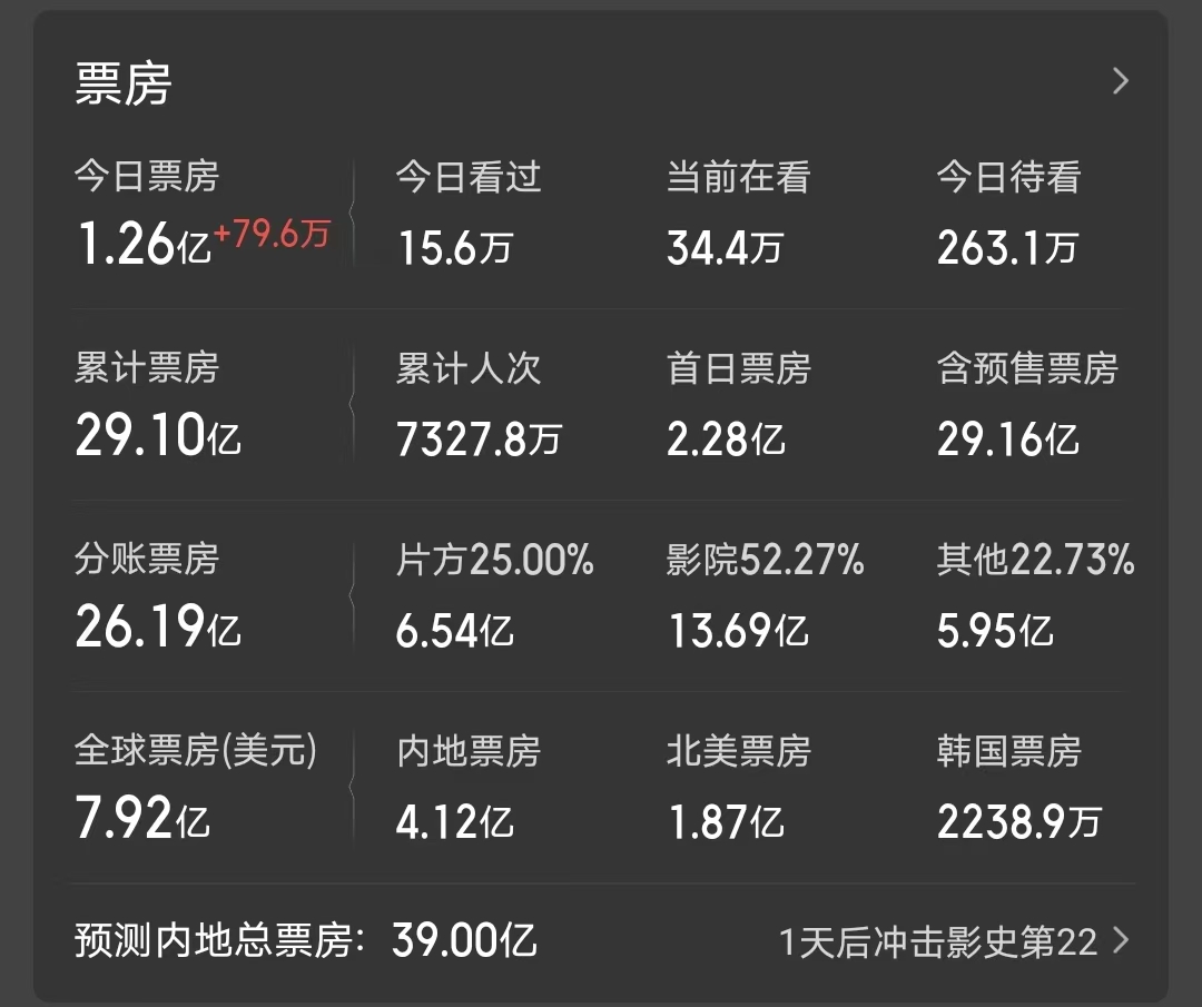 就像由饺子导演执导的国产动画《哪吒2》,全球票房超159亿人民币,直接挺进了全球影史票房榜前五名,未来如果重映,它甚至还可能会打败《泰坦尼克号》,拿下全球第四的名次。但是在此片超159亿人民币的全球票房中,有近155亿都是来自中国内地,海外票房的占比都不到3%。
