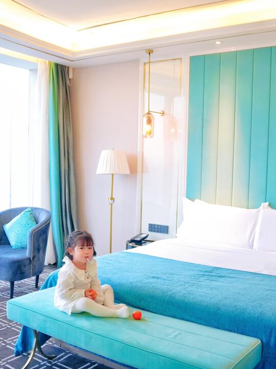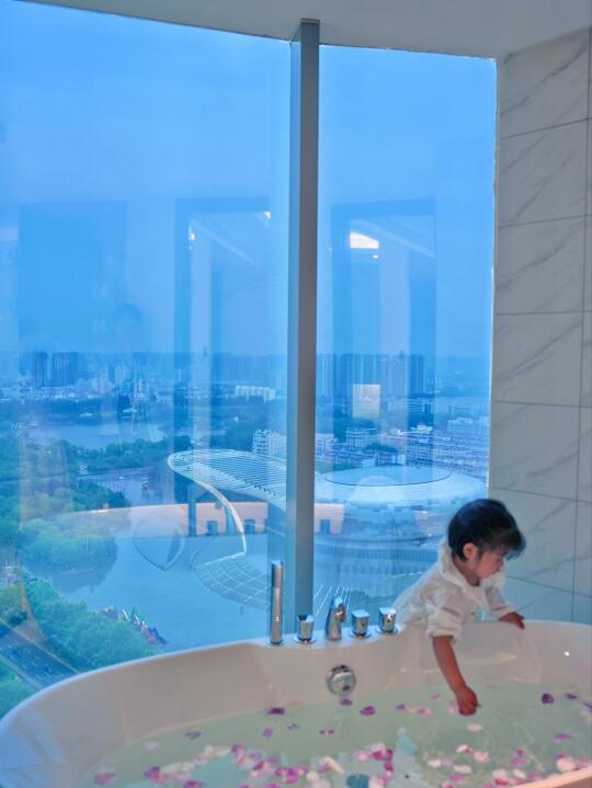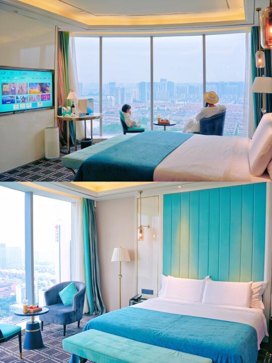 酒店房间Tiffany蓝风格很梦幻,房间里超大落地窗和浴缸直接俯瞰邯郸博物馆,景观yyds!夜幕降临,边泡澡边赏景,仪式感拉满