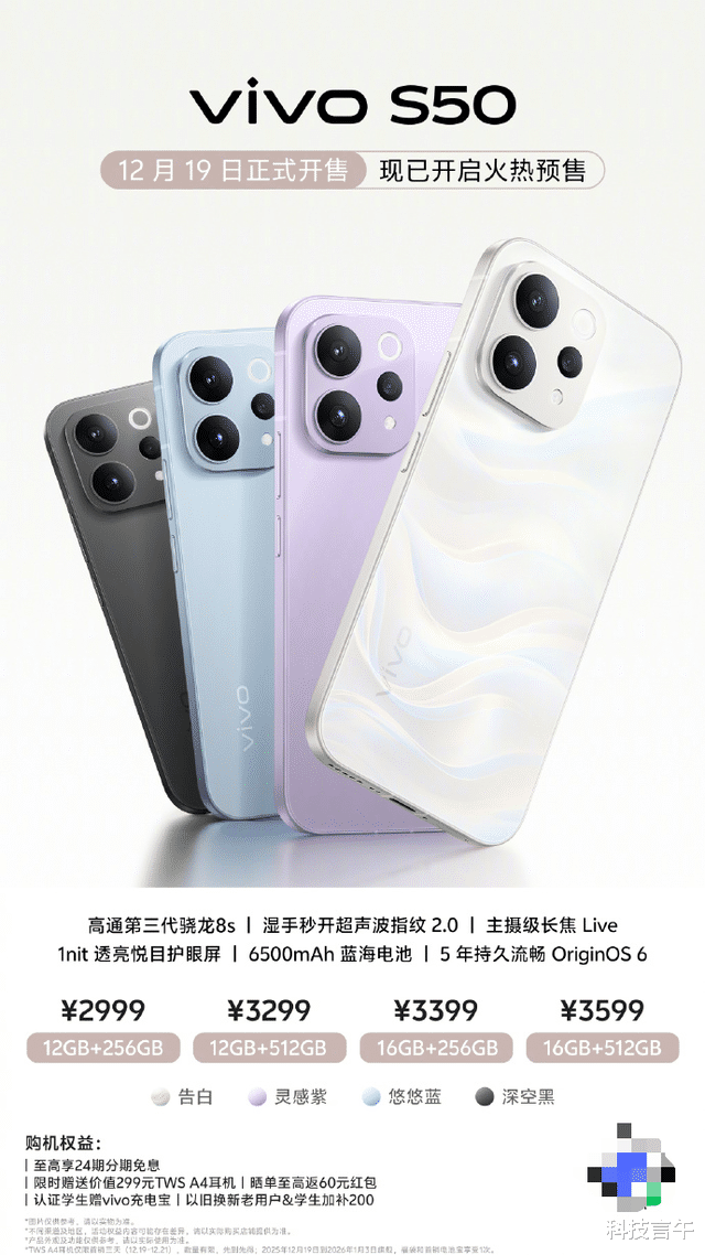 目前,vivo S50系列已经正式开启预售,并将在12月19日开售。全系2999元起的定价,加上首销阶段丰富的赠品与换新补贴,让这款“情绪与实力并存”的新机更具吸引力。如果你想要一部既好看、好拍,又足够全面耐用的手机,vivo S50系列确实值得在预售阶段重点关注。
