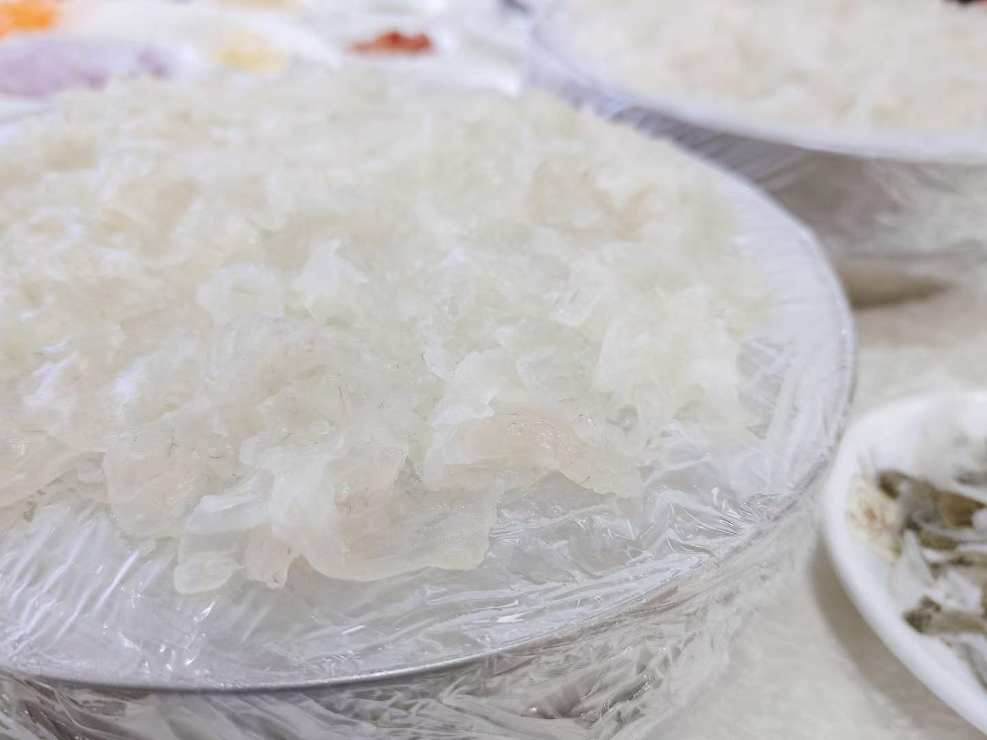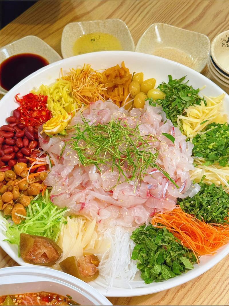 而横县鱼生则是一场风味的狂欢。它不避讳鱼肉的些许血色,认为这能保留更浓郁的鱼鲜。上桌时,主角已非孤零零的鱼片,而是被一大盘“配角”众星捧月——酸爽的柠檬、荞头,气息独特的鱼腥草(折耳根),清香的紫苏、薄荷,还有香脆的花生、芝麻等。