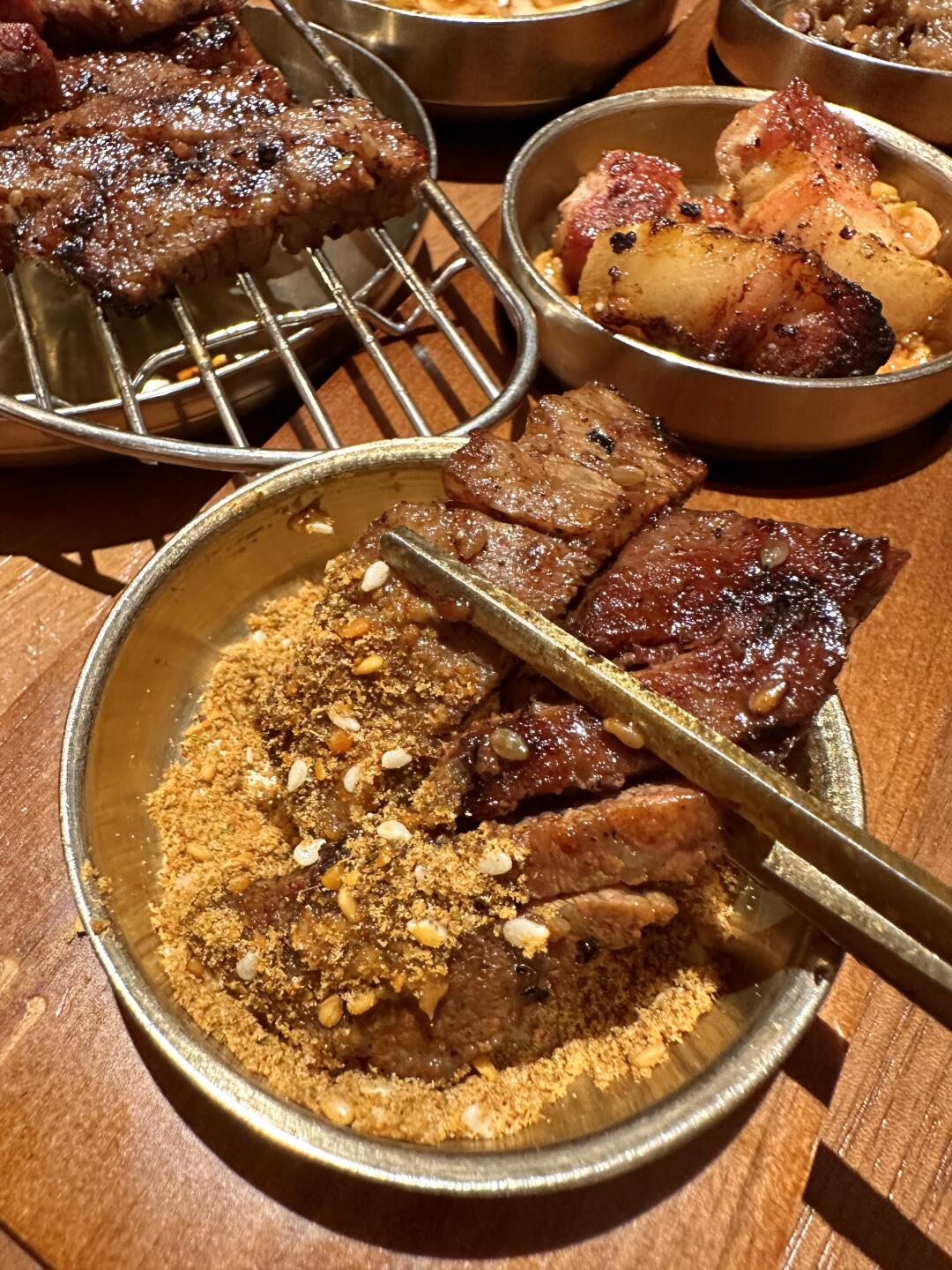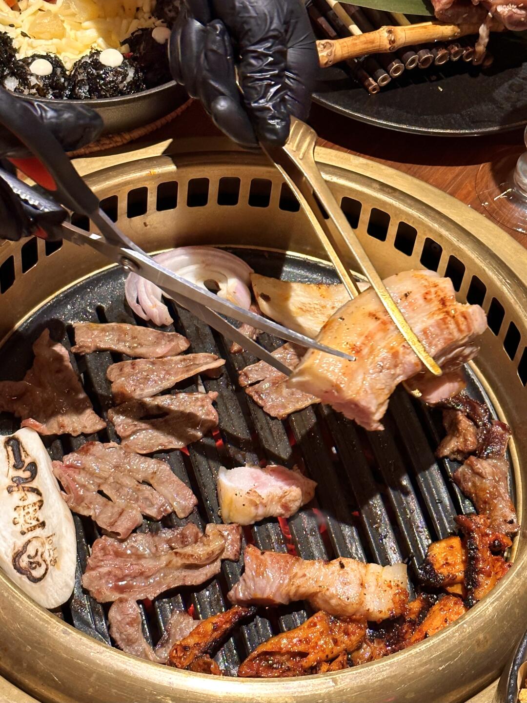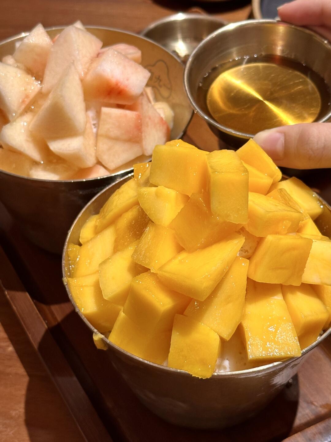我们点了横膈膜和雪花牛肋条,品质很不错 空口吃都绝了…芝士辣八爪鱼 混着海苔碎和米饭一起拉丝,香辣入味真的不要太好吃了!还有芝士泡菜饼、年糕拉面、水果雪花冰…我们点了一大桌都没踩雷!性价比很高!!