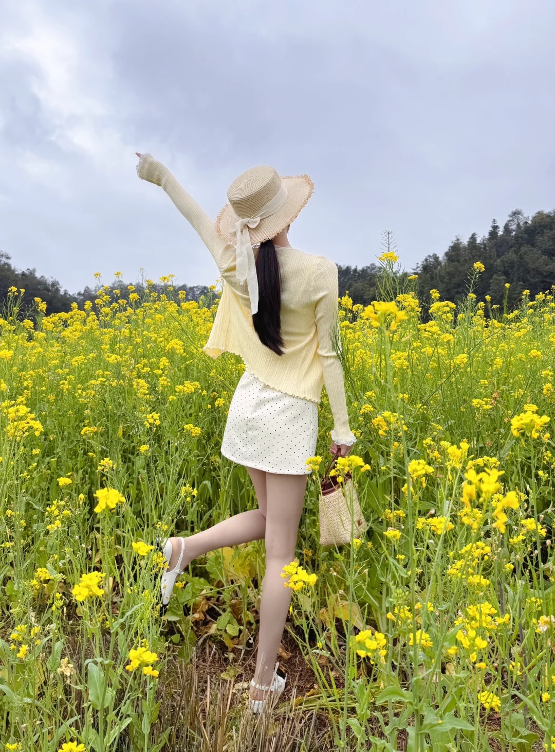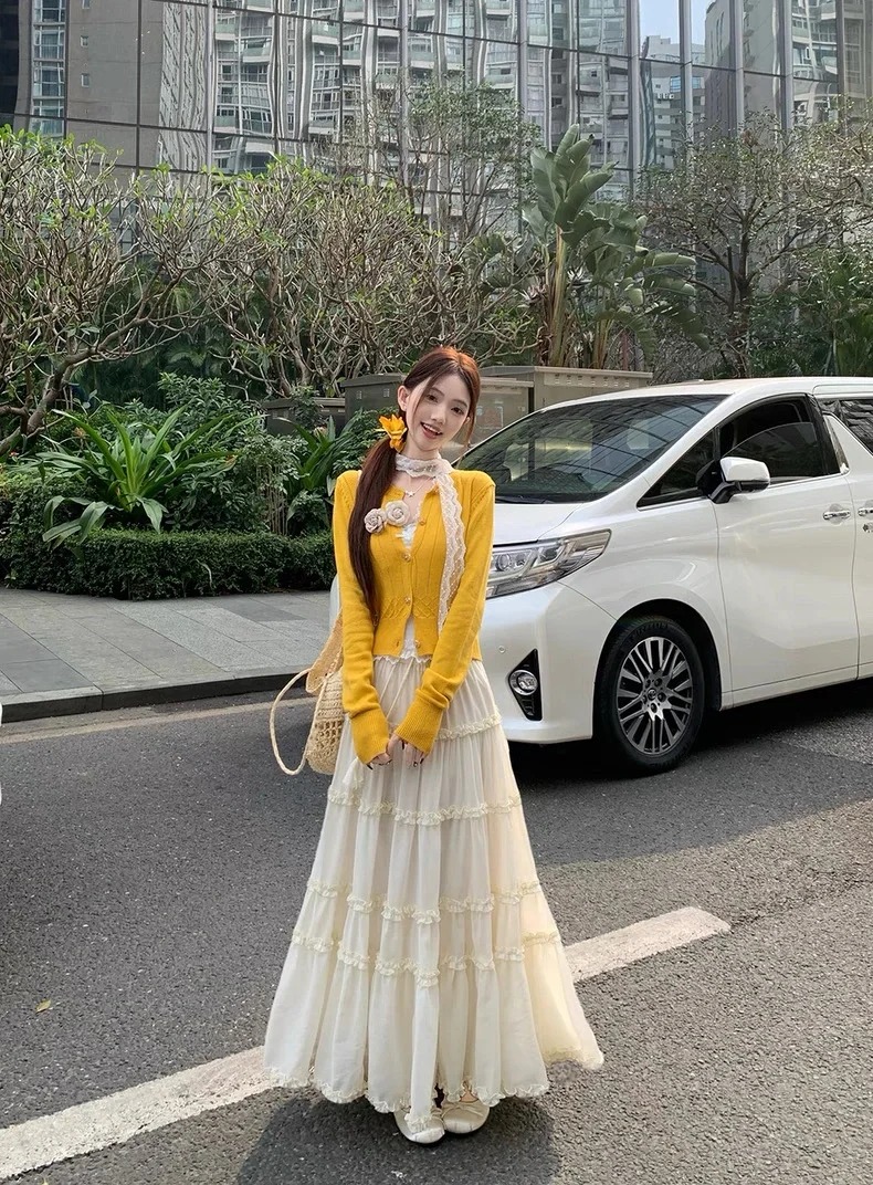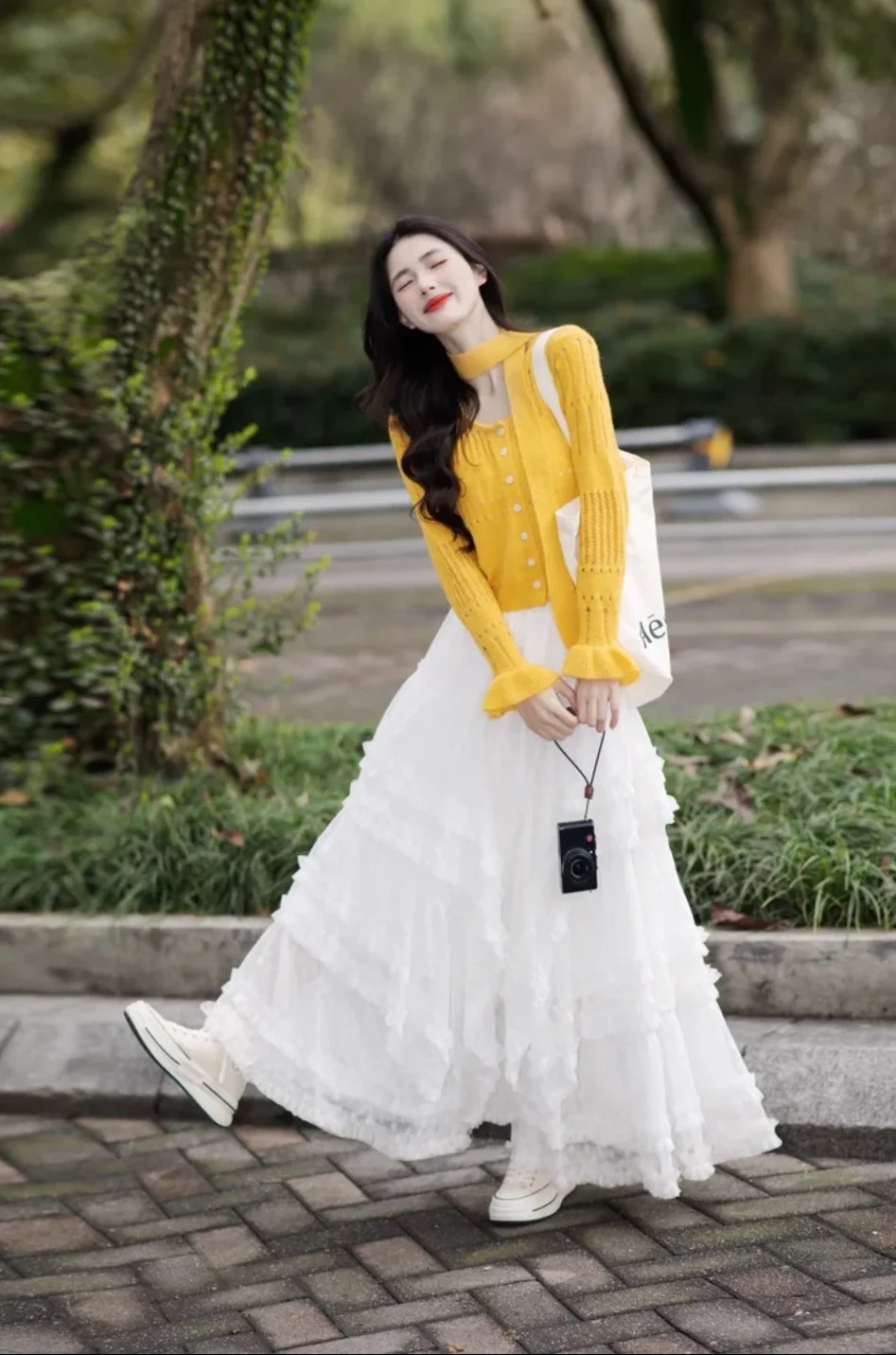 鹅黄色针织衫,无论是套头衫还是开衫,加上贴身的版型设计,可以轻松勾勒出曼妙曲线。搭配层层叠叠的蛋糕裙时,一瞬间化身森系女神,这样的单品组合,无需过多的装饰,走到哪里都是一道风景线。