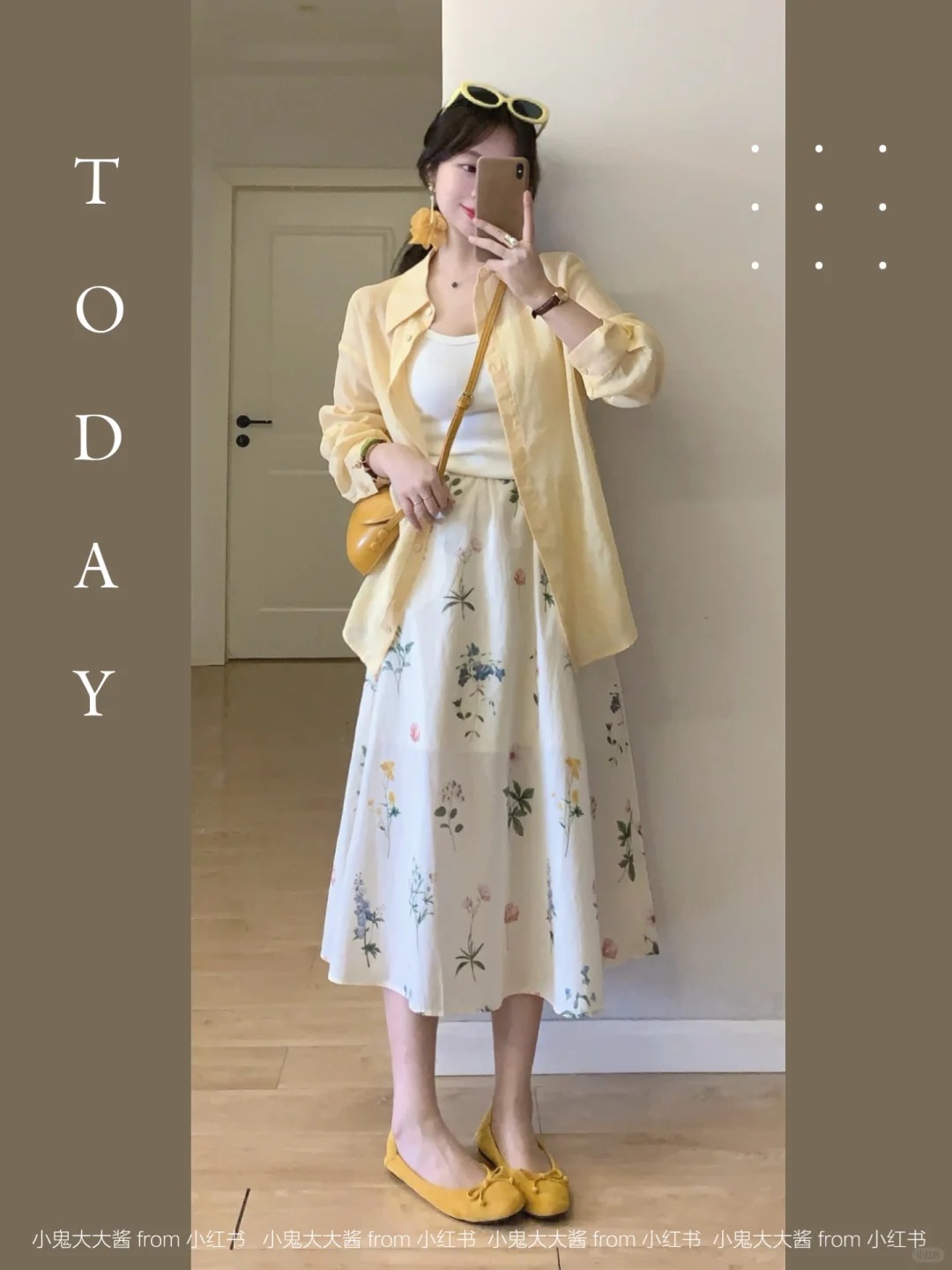 选择花草图案的碎花裙,当黄色衬衫遇上白色系印花,瞬间唤醒初夏的记忆。挽袖口是衬衫搭配的必备,显瘦的同时也更利落,至于包包和鞋子,也推荐黄色系,法式田园风竟如此简单。