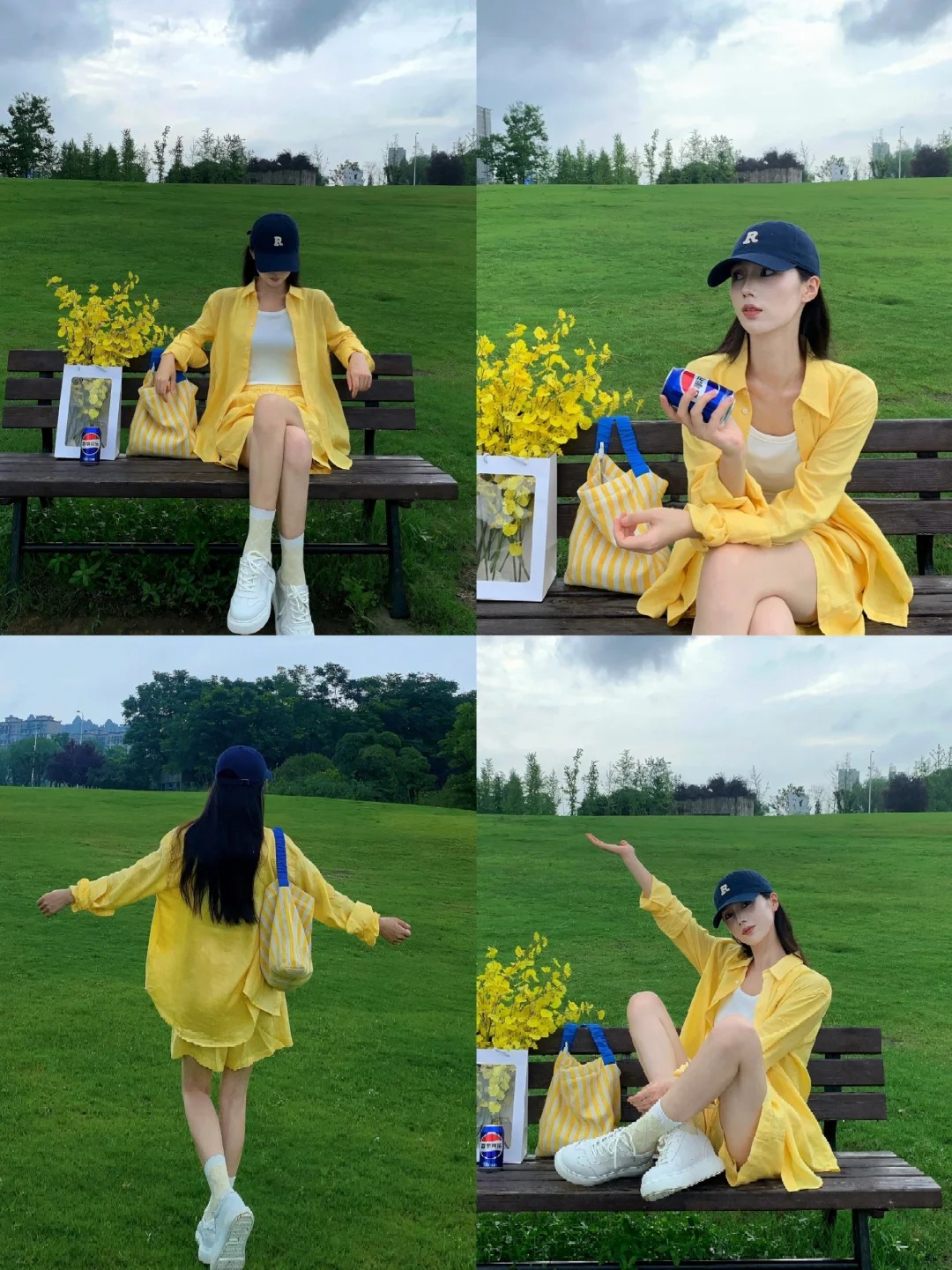成套穿的秘诀在于"露肤度"。选择落肩设计的oversize衬衫,搭配同色系短裤,内搭选择白色小吊带,白色运动鞋加持,深蓝色棒球帽稍稍的削弱一下黄色带来的视觉冲击,既个性,又增添了度假风的慵懒气息。