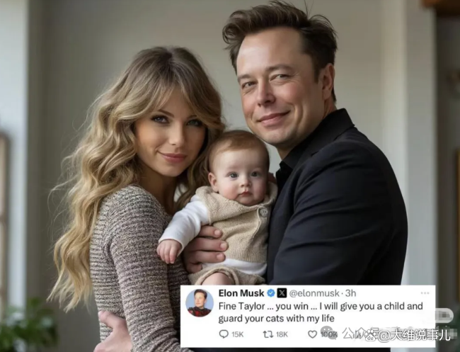霉霉在社交网站上发布了一篇支持哈里斯的长文,并用“childless catlady”署名。马斯克回应霉霉,马斯克随即在X上发了一条推文回应霉霉:“我会给你一个孩子,然后用生命去守护你的猫!”提出试管婴儿或代孕的可能性。美国的吃瓜群众也是看热闹不嫌事大,霉霉的粉丝中有一些人都觉得35岁的霉霉是需要个孩子了,支持霉霉和马斯克走试管代孕的还真不少,有人竟然一夜之间连预想图都画出来了(上图就是)