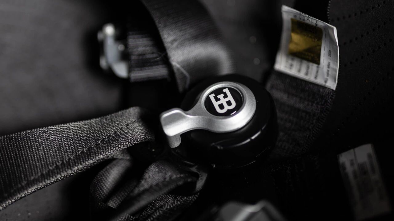 轮毂采用夜影色涂装搭配黑色中心盖,引擎舱覆盖黑色碳纤维饰板,将那台1600马力的W16猛兽低调掩藏,静态时尽显内敛,启动后便释放雷霆之力。