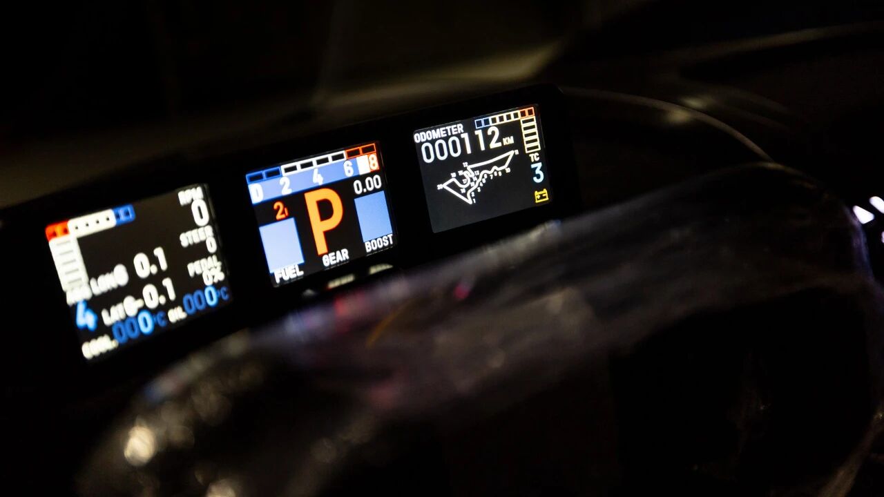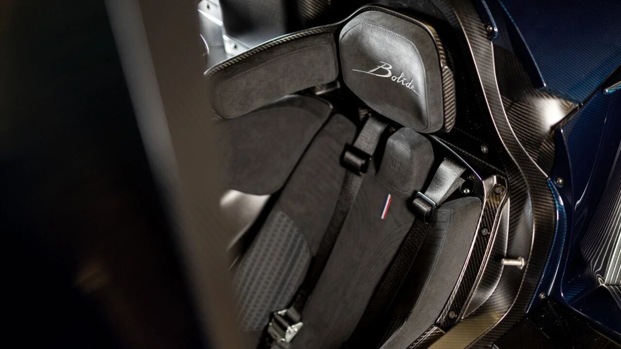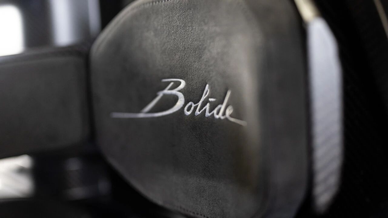 内饰以赛车化风格为主,通体采用贝尔加黑Alcantara材质包裹,缝线同色呼应,简约却不失奢华。赛车桶形座椅头枕处,以阵风灰缝线绣出Bolide专属标识,精致感拉满。