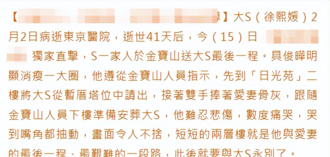 葬礼当天,他捧着骨灰盒,一路从日光苑二楼的暂厝塔位走到墓地,期间数次哭到嘴角抽搐,可见他对大S用情至深。
