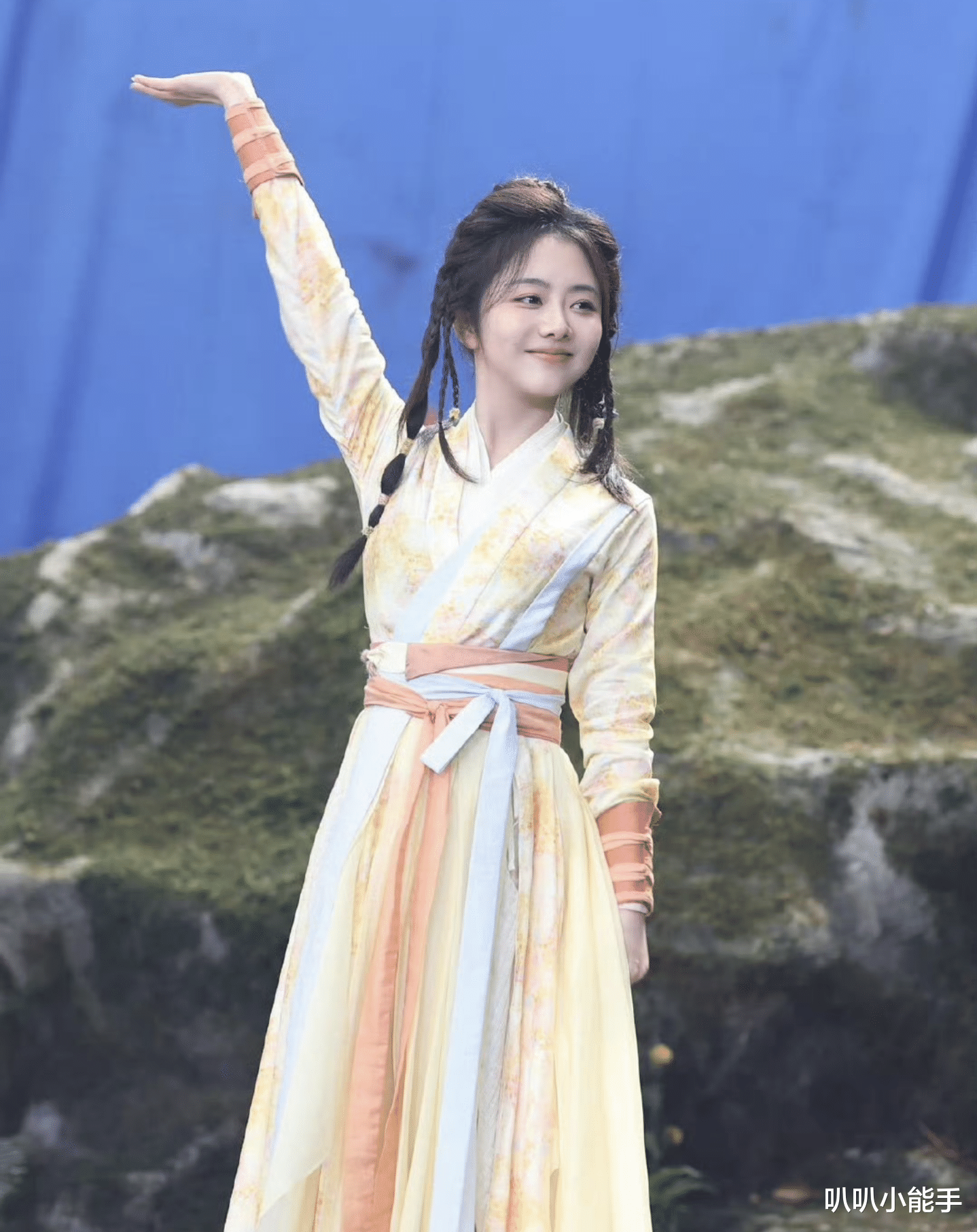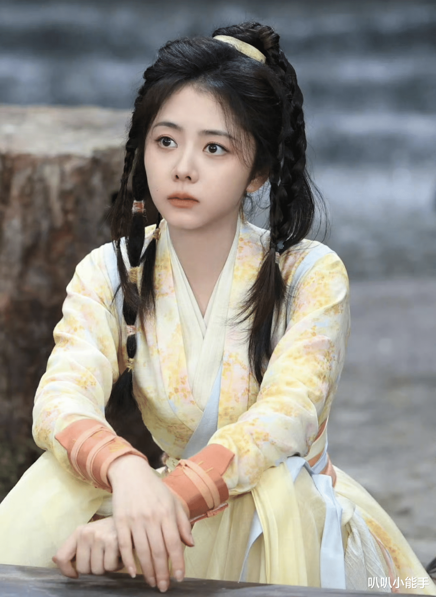 先说说这造型,明黄色的古装,配上那些精致的小纹路,看着就特别清爽。那俏皮的小辫子,发丝规整又带着点活泼感,不像是精心打造的造型,倒像是小姑娘自己高高兴兴编的。没有大浓妆,清透的妆容把她的娃娃脸优势给发挥出来,笑起来眼睛弯成月牙,灵动的眼神加上一些小动作,比如歪头思考、手指轻轻勾发丝,那股子娇俏劲扑面而来,让人忍不住想说一句“这不就是从武侠小说里跑出来的机灵鬼嘛”。