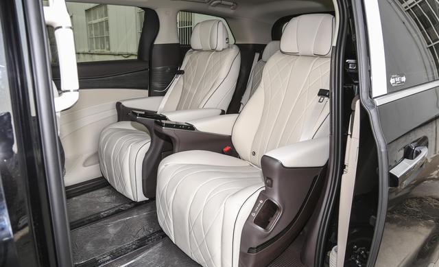 它着重提升第二排体验,标配电动调节、加热、通风、按摩功能,且控制界面为触摸屏。第三排可前后、靠背调节,空间灵活。还标配车载冰箱与丹拿音响。