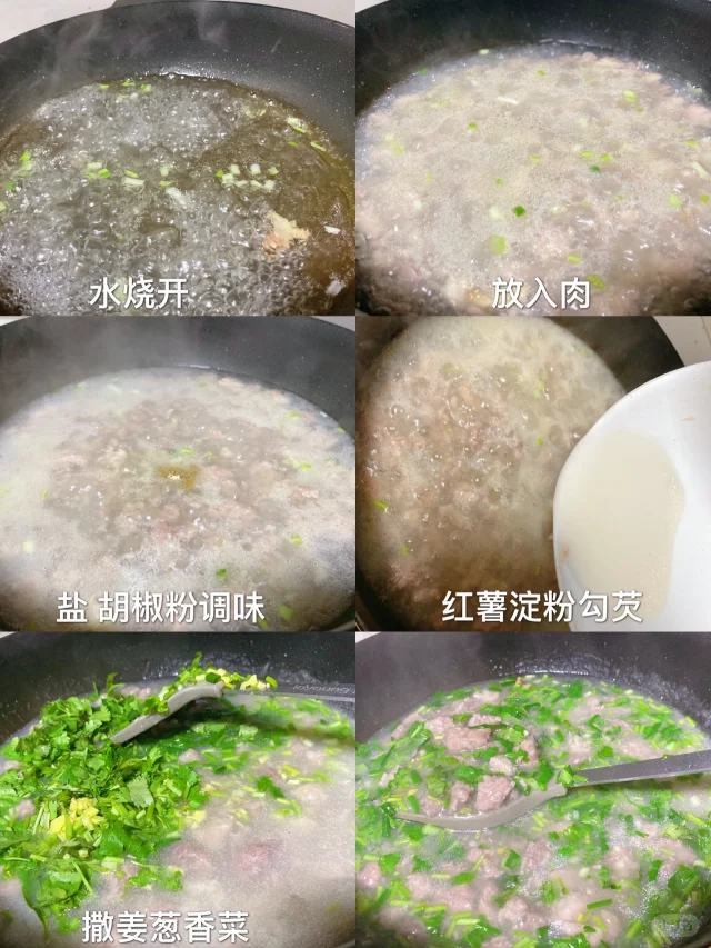 3⃣️:放入半勺胡椒粉 半勺盐🧂调味,倒入水淀粉勾芡(红薯粉加1:5的水)