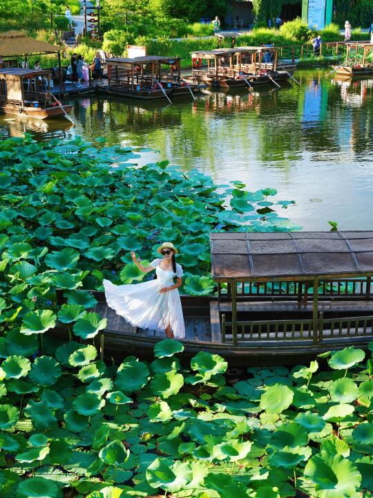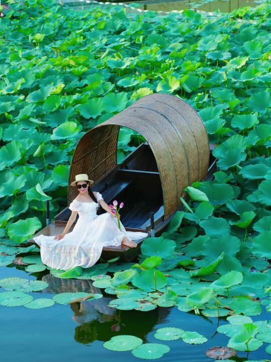 4️⃣荷花拍照很适合古风连衣裙、汉服,想要出片可以带些道具,油纸伞、扇子🪭、荷花、荷叶