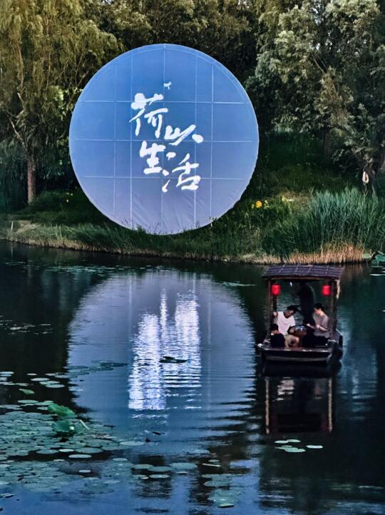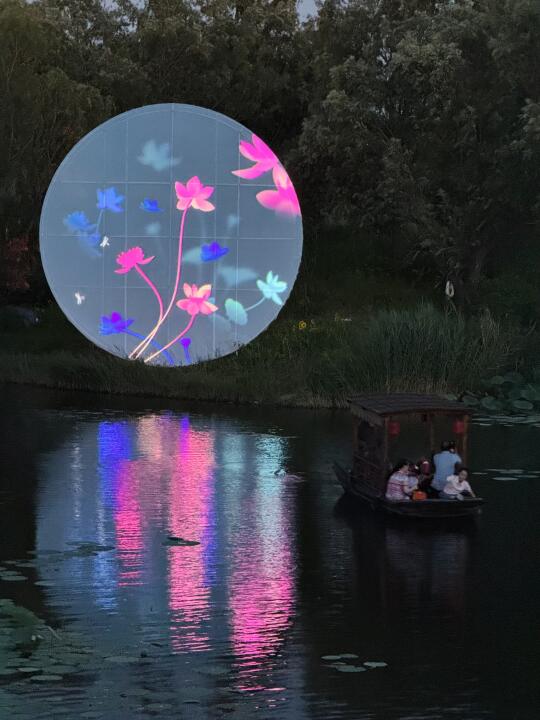 5️⃣傍晚19:00开始的“与荷共舞”水上光影秀真的是一场超越想象的视觉盛宴,三个圆形幕布上数字动画倒映在湖面上,与荷花🪷树影形成“双生镜像”,简直美轮美奂,当摇橹船经过时,氛围感和艺术感真的很绝,手机live图不及肉眼看到的美