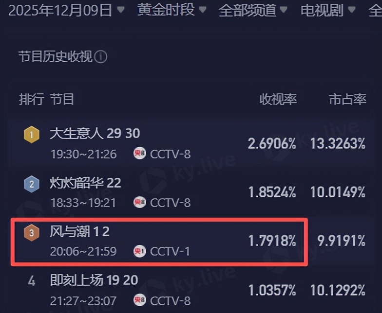 12月9日开播的年代商战大戏《风与潮》,刚开播10分钟就创下酷云实时收视率破1.7%的惊人成绩,峰值更是冲到2.3542%,直接登顶同时段收视榜首,堪称年度“收视黑马”。
