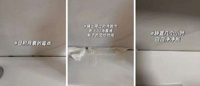 用84消毒液浸湿洗脸巾或纸巾,直接敷在长霉斑的地方,静置一夜。第2天早上起来,你会发现霉渍真的“神秘消失”了!