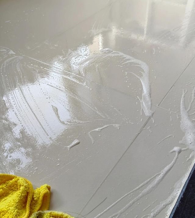之后再用海绵蘸取膏体,在玻璃上打圈擦拭,擦拭过程中,你会发现玻璃上的阻力逐渐变小,等到手感光滑时,用清水一冲,玻璃瞬间焕然一新!