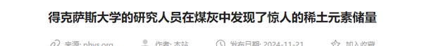 中国稀土网:得克萨斯大学的研究人员在煤灰中发现了惊人的稀土元素储量 2024-11-21