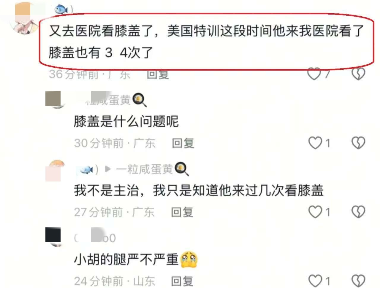 其实胡明轩出现这个情况,有细心的球迷的发现情况了是另有隐情。最近有媒体人就爆出,胡明轩最近已经有三四次去医院检查膝盖的伤势了,还有球迷拍到他去医院的照片。另外还有医院的医生也证实了这个情况,说他膝盖已经是有比较严重的积液存在。那就是胡明轩他从上个月底开始的男篮世预赛和CBA常规赛开始都是带伤出战,所以不奇怪他这4场比赛都是发挥低迷。