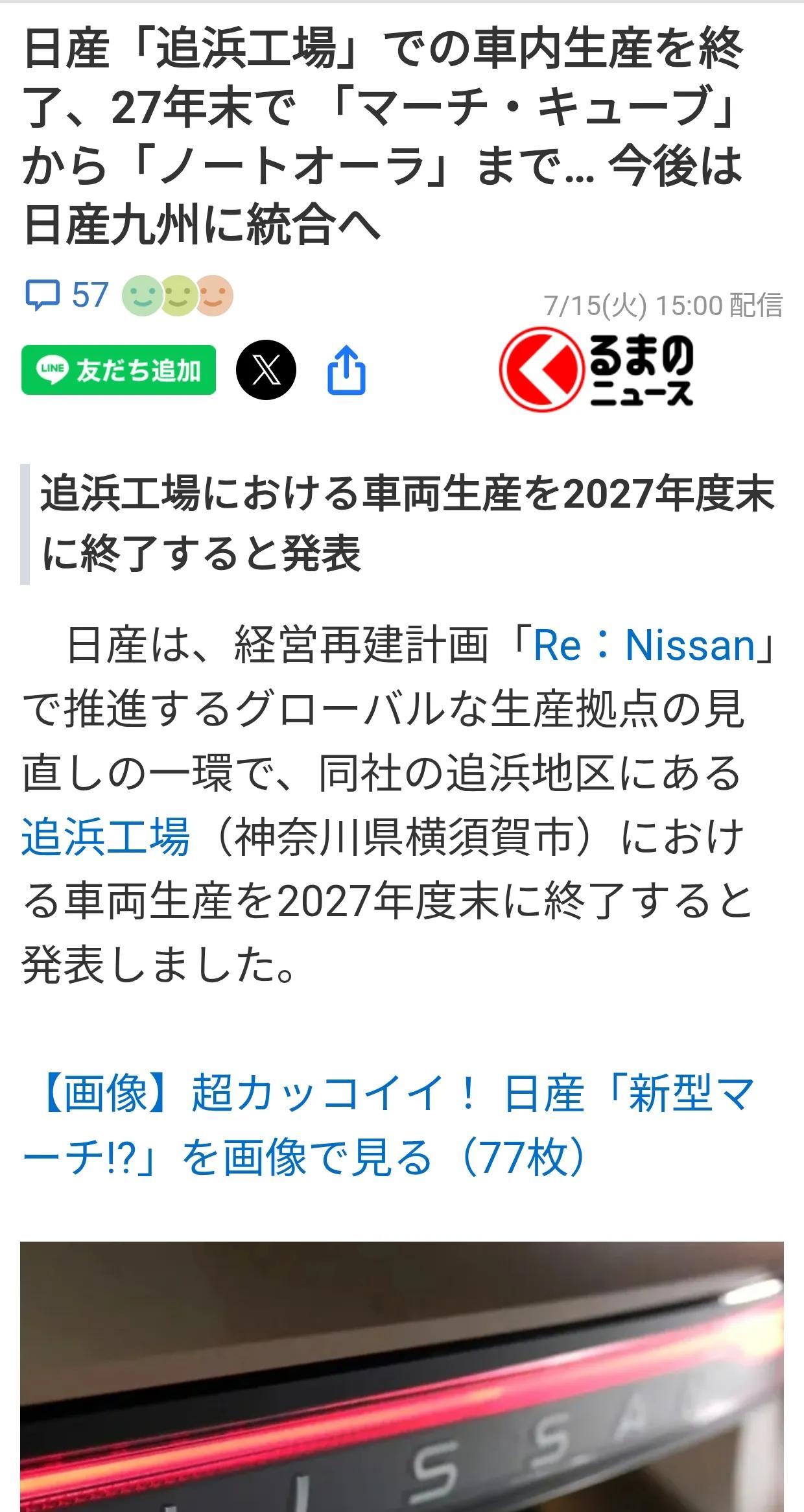 日产汽车主力工厂2027年停产 7月15日日媒报道:日产汽车宣布:作为管理层重组计划“Re:Nissan”的一环,将到2027财年末将关闭位于神奈川县横须贺市的追浜工厂的整车生产。 资方已经计划与工会就员工雇佣事宜签订协议。 该工厂的生产将转移至日产九州工厂(福冈县苅田町)町)进行整合。 目前在追浜工厂生产的车型包括 Note 等(包括 Note Aura)。