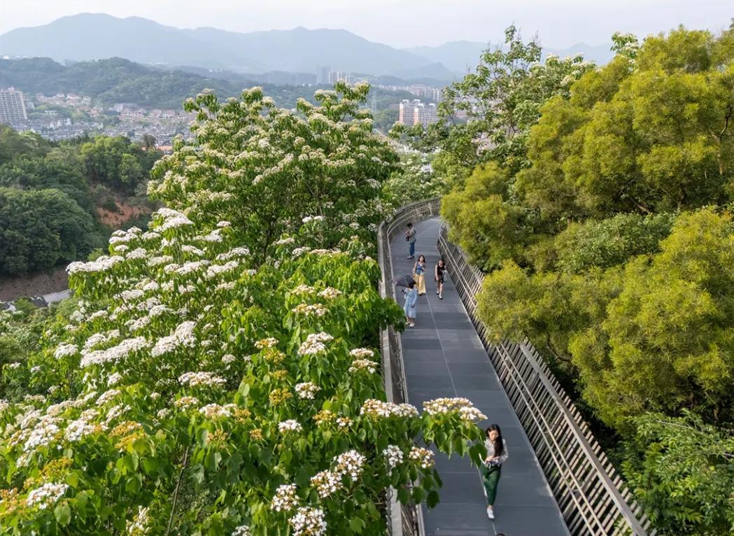 沿着公园的福道前行,一股淡淡的花香扑面而来,洁白的花瓣随风飘落,在山间撒下一抹诗意。