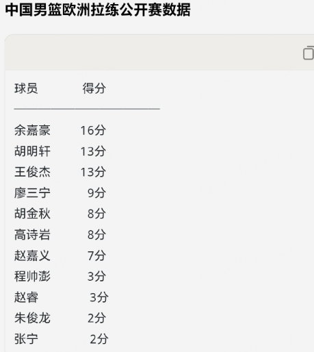 中国男篮VS荷兰男篮热身赛球员数据公开。 其中王俊杰,于嘉豪,王俊杰表现亮眼,