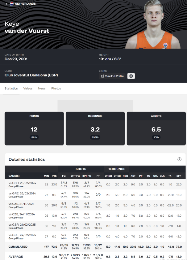荷兰这个1号小后卫挺厉害的,这人今年欧预赛上6场比赛场均12分3.2篮板6.5助攻,难怪观感上打这么好,抛投、三分什么的都挺好。