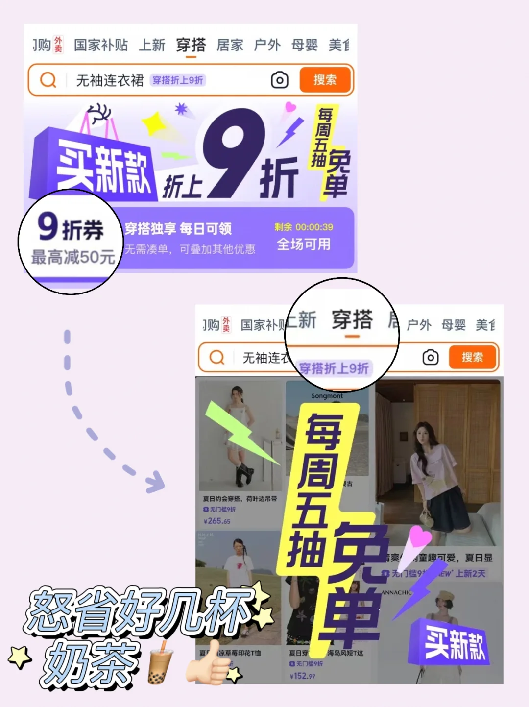 2⃣进入到🍑宝穿搭里,每天都可以领折上九折!可以叠叠88VIP、叠大促满减、店铺券、红包。。。还不用凑单!!实打实的省下几杯奶茶🧋!!