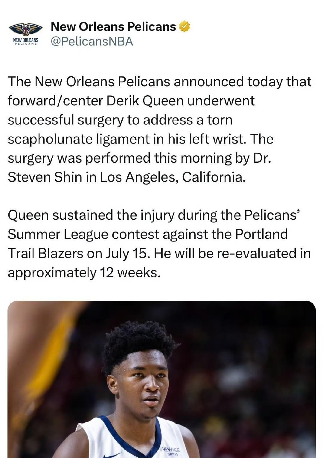 鹈鹕队今日宣布,中锋德里克-奎因成功接受了左手腕舟月韧带撕裂修复手术。 该手术于今日上午由史蒂文-申医生在加利福尼亚州洛杉矶进行。 奎因是在7月15日鹈鹕队对阵波特兰开拓者队的夏季联赛中受伤的。他将在约12周后接受复查。