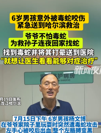7月18日(发布),黑龙江牡丹江。6岁男孩意外被毒蛇咬伤,紧急送到哈尔滨救治。爷爷不怕毒蛇为救孙子连夜回家找蛇,找到毒蛇并将其打晕送到医院。“就想让医生看看能够对症治疗”。