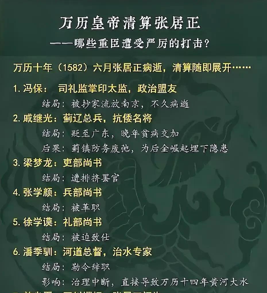 万历清算张居正时,有哪些重臣受到牵连? 1582年张居正辞世之后,万历皇帝旋即开展清算行动。张居正有三位重要的助力者,在清算过程中,他们及其相关人员均受到牵连。 冯保乃是张居正的重要盟友,承担着内廷与外廷之间沟通的职责。张居正故去之后,冯保被万历皇帝以“欺君蠹国”的罪名,谪贬到南京守陵,其家产也被抄没。 戚继光和张居正的关系十分紧密,在张居正的支持下,戚继光在军事方面取得诸多功绩。张居正倒台之后,戚继光被调往广东,而后又被罢官归乡,最终在穷困潦倒中离世。 此外,像曾省吾、王篆等人,他们作为张居正改革的支持者,在清算行动中也被革职。这场清算使得张居正改革的成果严重受损,明朝也丧失了继续走向振兴的契机。