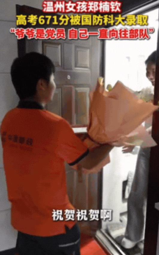 “光宗耀祖了!”浙江,女生开门收快递,快递员突然从背后拿出一束花!对着女生说:郑楠钦同学,祝贺祝贺啊!说完就将录取通知书递给女生,原来,女生高考671分,成功被国防科大录取,女生坦言:爷爷是党员,自己一直向往部队!
