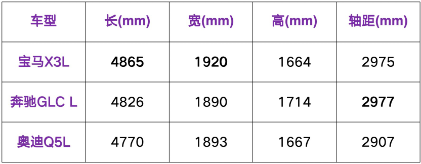 这样一来,宝马X3L的车身,一下子就反超了长轴版的奔驰GLC L和奥迪Q5L,甚至比Q5L长了将近10公分,另外X3L的车身宽度达到了1920mm,也明显比两款竞品更宽一些。