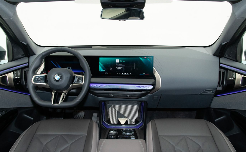 座舱内部,换成了宝马新的双联屏布局,出风口做了隐藏化设计,和两侧车门上的氛围灯装饰区融为一体,整个座舱布局大幅简约化,又在方向盘、扶手台上保留了必要的机械按键和旋钮。
