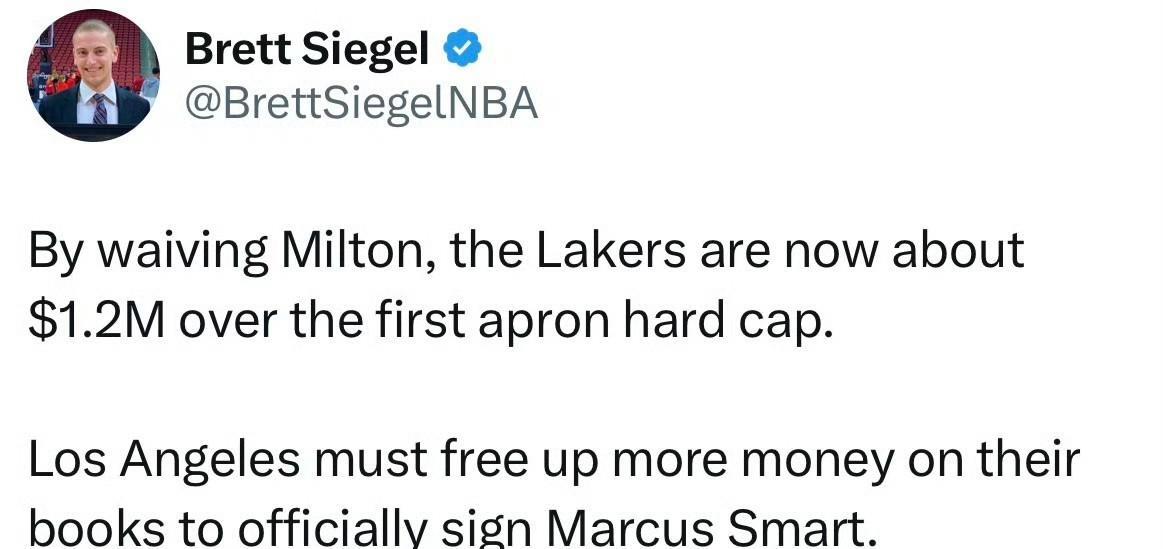 下一步清理空间!!!湖人签约斯玛特超出第一奢侈税120万! 裁掉米尔顿湖人距离第