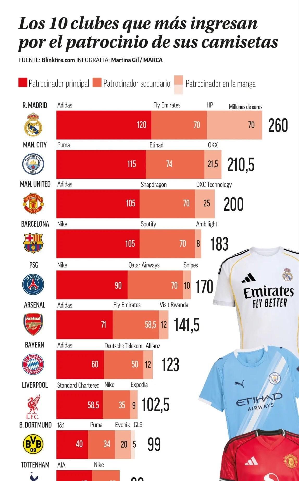 皇家马德里拥有世界足球最高的球衣赞助收入,也可以说是品牌价值最高的足球俱乐部。 俱乐部球衣品牌赞助每年产生2.6 亿欧元的收入,其中1.2 亿欧元来自阿迪达斯, 0.7 亿欧元来自阿联酋航空的 ,另有0.7 亿欧元来自惠普。 欧洲足坛球衣赞助收入排名第二,三的分别是曼城和红魔,都超过了2亿欧元。虽然排名第10,热刺的球衣赞助收入只有可怜的8000万欧元,与皇马差距巨大。