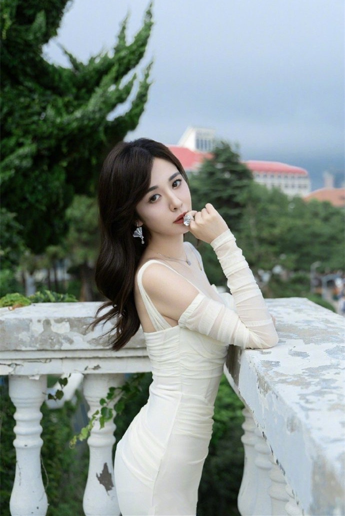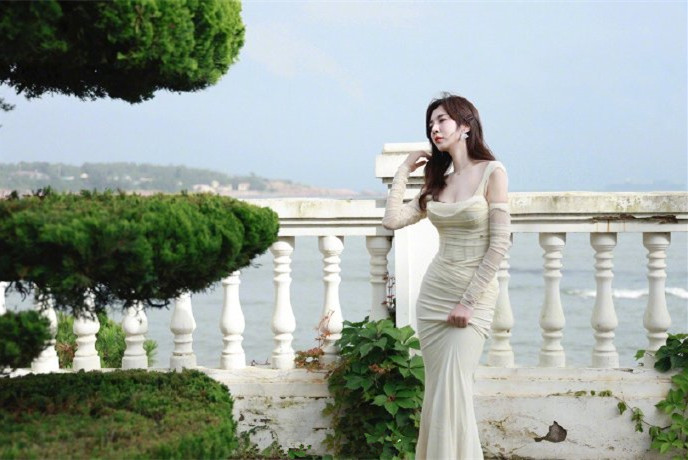 王晓晨穿白色长裙在海天背景中,散发出优雅静谧的迷人气质