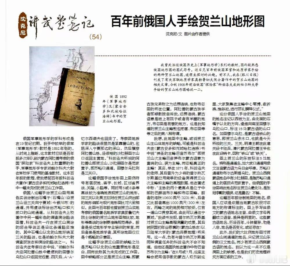 我所见较早的俄军《军事地形学》教材是1892年版的(图5)。我在《银川日报》讲武堂笔记中以图文提到此书(图6)。从时间上推断,这本教材应该是百年前多次率队到内蒙古阿拉善考察的俄国“探险家”科兹洛夫上校重要的助手,军事地形学专家纳帕尔科夫大尉在军校学习使用的基准教材。这本143页硬皮精装的教程中,前100页讲述地形的地貌晕渲方法、等高线原理、三棱尺使用、比例尺地物符号等,都是为后面简易平板测图做准备和铺垫。这本百年前的教程,使我想起百年前科兹洛夫著作《蒙古安多哈和死城拉浩特》书中一幅未完成的贺兰山工作图。