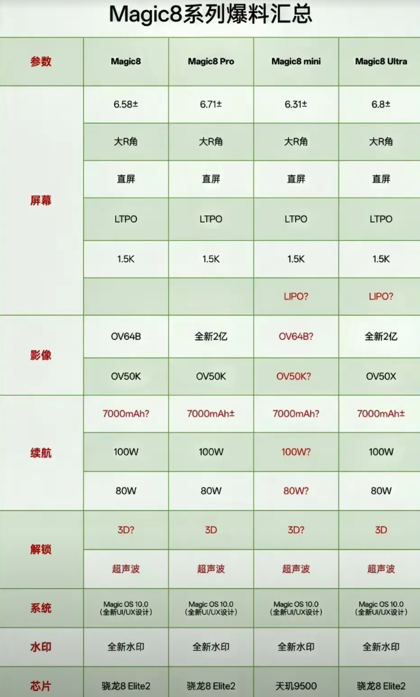 今年的荣耀Magic8系列,真心值得重点关注! 配置这块堆料够猛,青海湖电池直接干到7000mAh级别,续航焦虑党狂喜。 全系采用直屏设计,这点对于不喜欢曲面屏误操作的用户来说绝对好评。 影像上诚意很足,主摄和潜望长焦镜头都迎来了升级,拍照体验值得期待。 处理器方面,天玑和高通的双旗舰芯策略,性能稳了。更贴心的是覆盖了大、中、小三种屏幕尺寸,选择更多样。 再加上首发搭载的Magic OS 10系统,整体看下来竞争力很强。 只要定价合理,首发入手感觉稳赚不亏。