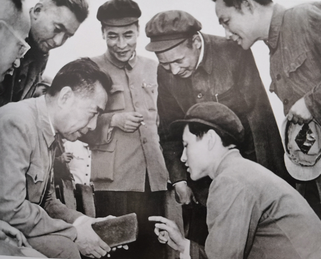 1962年6月,余秋里陪同周总理视察大庆油田。周总理非常专注地询问地质情况,认真听取工人专家的汇报。余秋里当时是国家石油工业部部长。在大家的共同努力下,大庆油田横空出世,解决了中国当时的贫油荒。