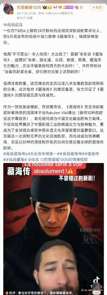 在TikTok上拥有24万粉丝的法国资深影视剧集评论人发布的视频中强力推荐《藏海传》,他用“不可思议!令人惊叹!太出色了!震撼”来形容《藏海传》,有力印证了《藏海传》的国际级品质与权威性。 而肖战成功饰演藏海,更是以封神的演技和炸裂的台词功底征服全球的藏海传剧迷。