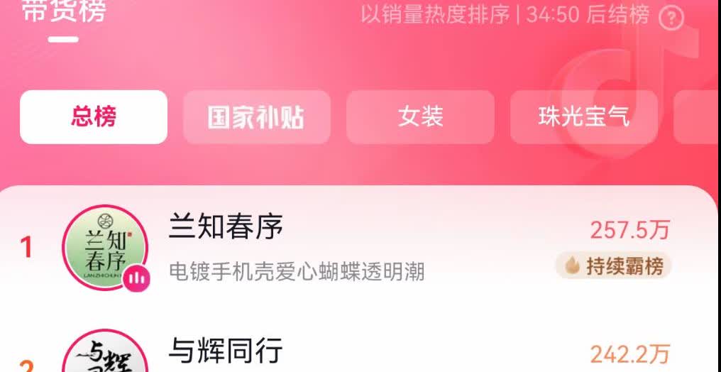 董宇辉云监工,真真首播成功。 彪哥据说在新疆迷路了,兰知春序真真首播,老板只能云监工。 老板还没灯牌。 网友说,能卷彪哥的只有彪哥自己。 兰知春序与与辉同行交替总榜第一。 兰知春序粉丝突破两百万了。 可喜可贺。