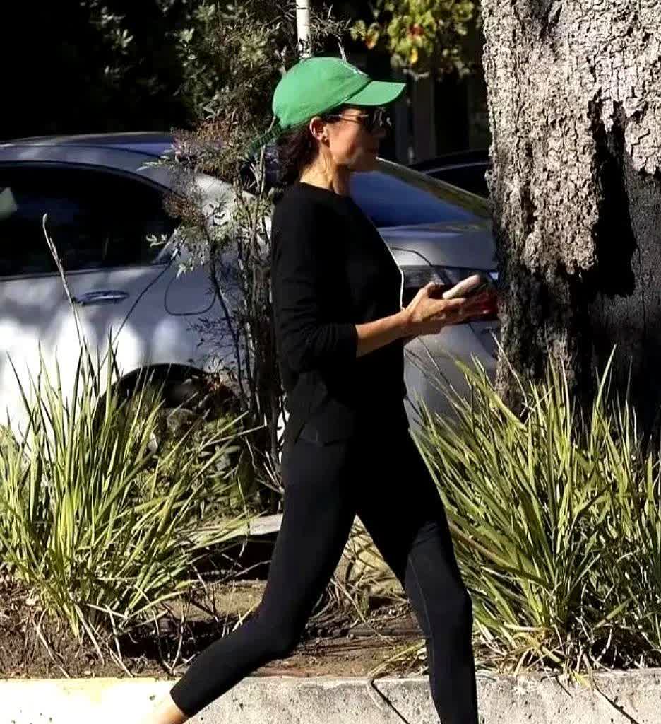 苏塞克斯公爵夫人梅根被拍到在圣巴巴拉外出,身穿黑色针织衫和鲨鱼裤,搭配运动鞋,看