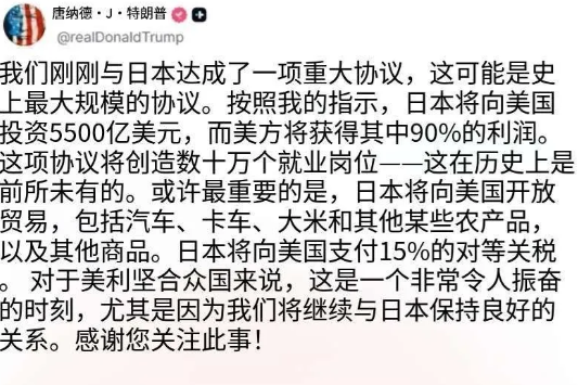 7月23日,特朗普突然宣布和日本达成了重大贸易协议,将日本的对等关税从25%大幅下调到了15%,实现了英国以外的全球最低税率。那么,这对于大选失败之后摇摇欲坠的石破茂内阁,会产生什么样的影响呢?
