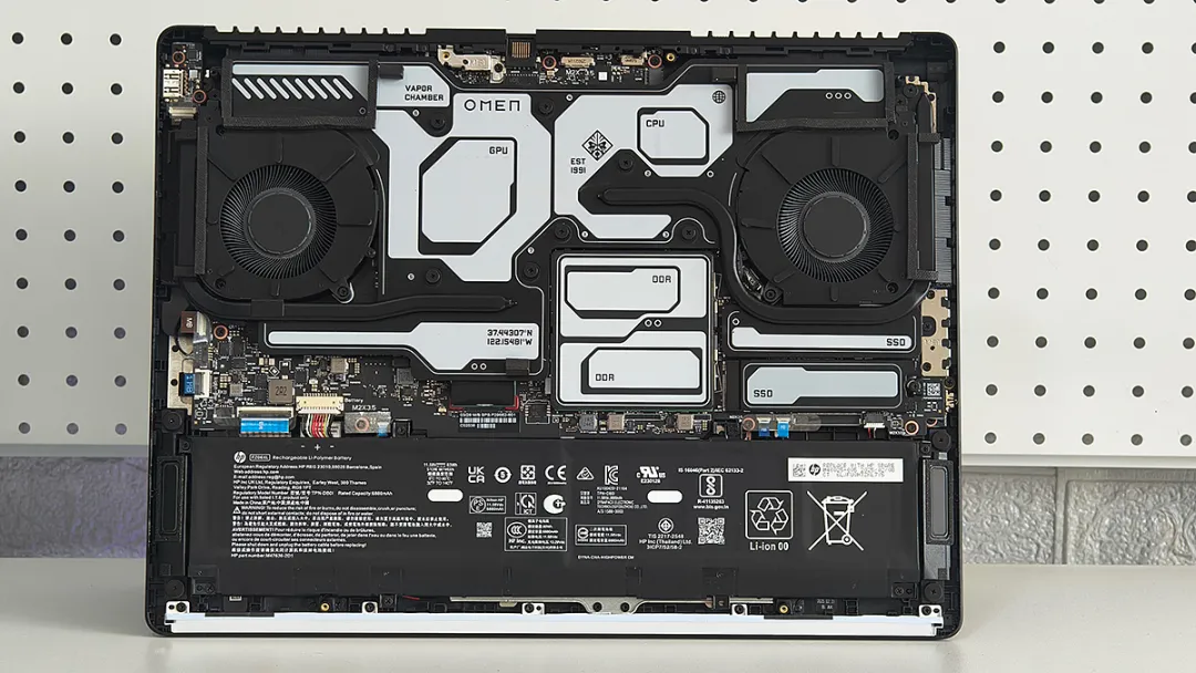 拆下底盖,映入眼帘的就是暗影精灵MAX主打的【酷凉风暴Max散热技术】,采用双风扇+VC均热板+双热管的混合散热方案,芯片表面涂抹信越8203混合液金,可以兼顾导热效率+防止偏移,整套散热结构清晰明了,整齐划一,看着就非常的赏心悦目。