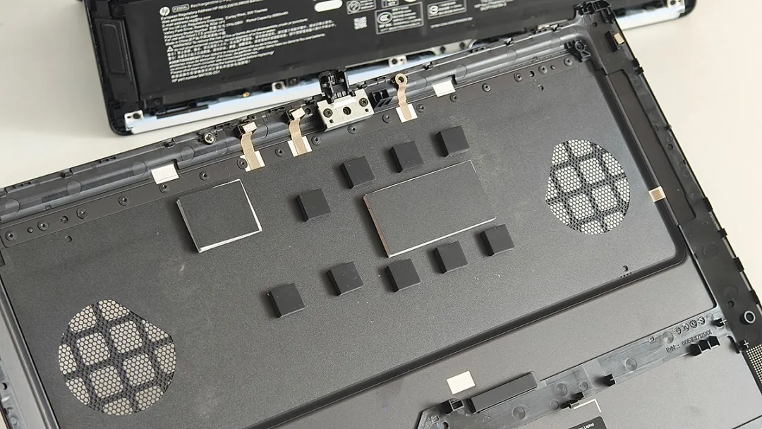 暗影精灵MAX底盖的上半部分有了一定的凸起,结合较厚的长条形脚垫,给予了内部更充裕的散热空间。