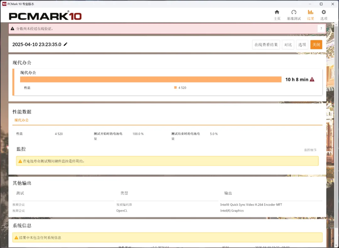 暗影精灵MAX的电池容量和上代相同都是83Wh,但这款产品在核显模式+节能模式,30%屏幕亮度,打开Wi-Fi关闭蓝牙的状态下,运行PCMark10的现代办公续航测试可以取得10小时零8分钟的续航成绩。作为参考,健圣去年评测的暗影精灵10(i7-14650HX+RTX4070),在相同测试环境下只有4小时出头,可见全新酷睿Ultra9 275HX在能效方面的改进,以及惠普在续航方面的优化都是非常给力的。
