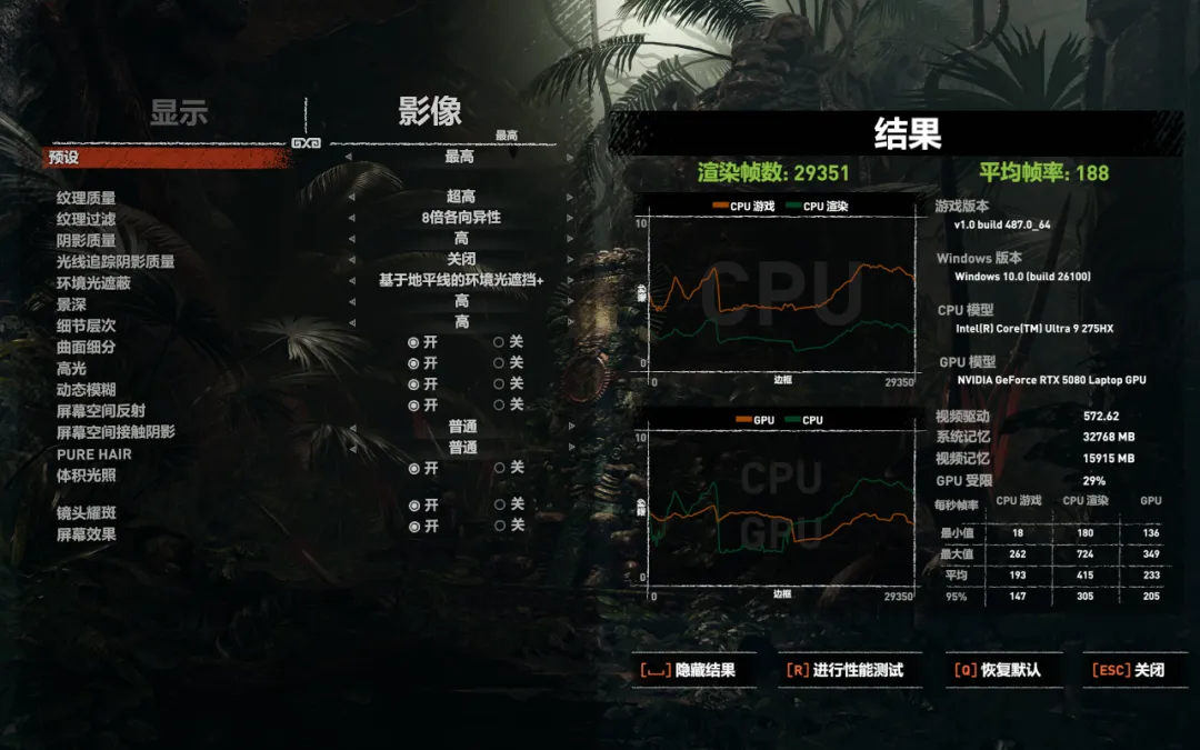 《古墓丽影 暗影》,最高画质下平均帧数188FPS。