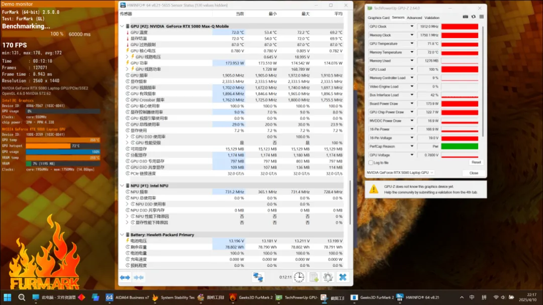 运行FurMark进行GPU单烤,显卡可以始终保持在175W左右的满血状态,GPU核心频率约1.9GHz,核心温度约72度。